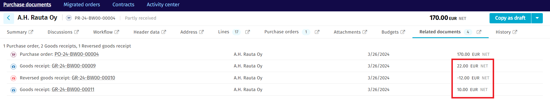 In the related documents, every goods receipt document now displays the net total of items received within that specific document. When there are multiple lines, the net totals of received items across all lines will be aggregated and presented.