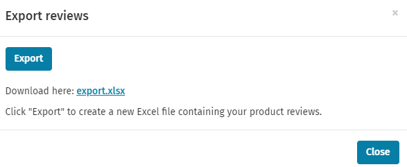 Clicking the Review button will open the Export reviews dialog. From there. the user can click the Export button or the export.xlsx link to download the review export.