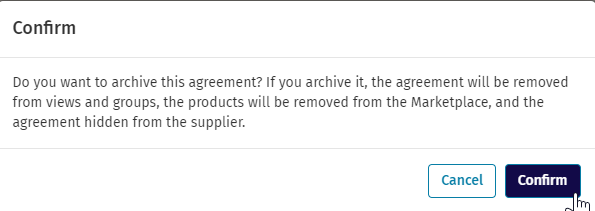 When archived, expired agreements will now also be removed from groups. A confirmation message is shown when the user clicks the Archive button on an expired agreement. The user must click Confirm to proceed with archiving and removing the agreement from groups and views.