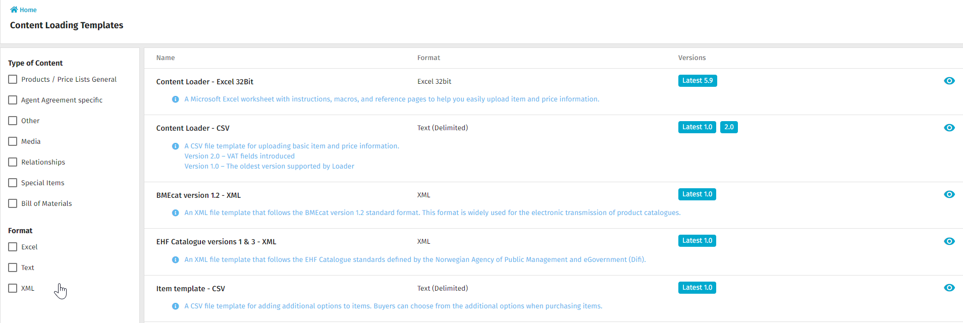 The user interface for the Content Loading Templates page has been updated to show content loader options with name, description, format, and version.